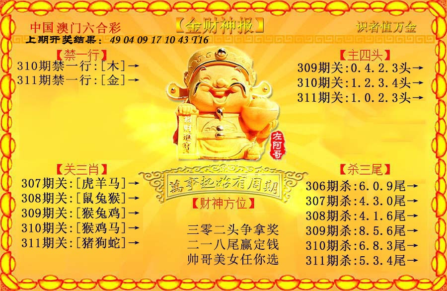 | 310期:内幕①肖+三中三开:虎16准 内幕①肖:【虎】 三中三:【43-49-17】 |